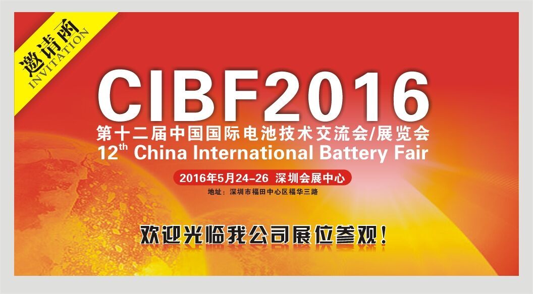 ? ? ? ?2016年5月24日-26日 ?第十二屆中國國際電池技術交流會/展覽會將在深圳市福田中心區福華三路,深圳會展中心召開,我司展位號:9F90號,歡迎廣大新老客戶,到我公司展位區域了解新產品和行業技術交流。